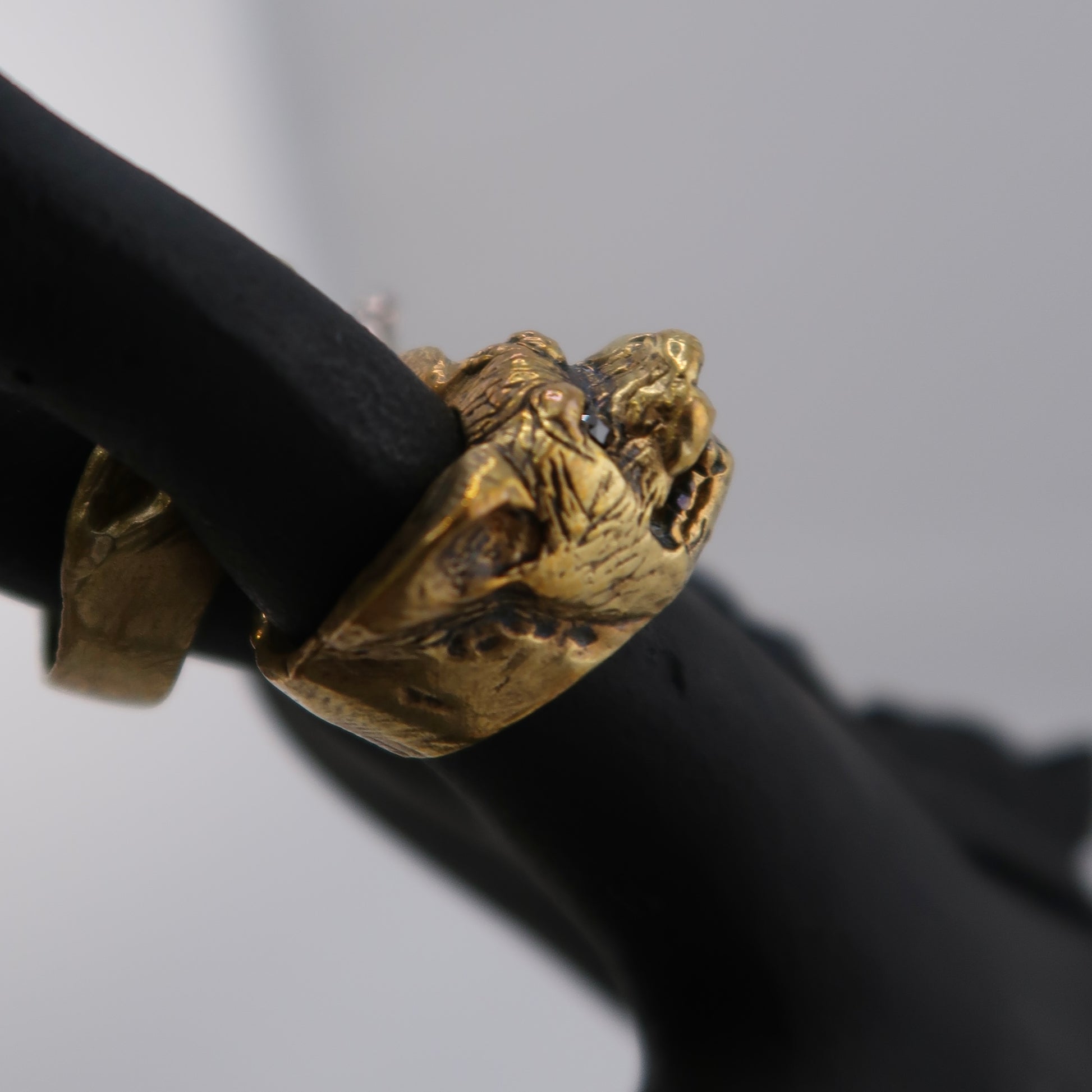 Inspired by medieval gargoyles, this is our earlier canine-like setting. Standing guard, the Argos ring can be custom made with or without gemstones in the eyes and mouth. It has a substantial weight and feel. This unisex ring is both brutish and modern. It is hand sculpted and finished.