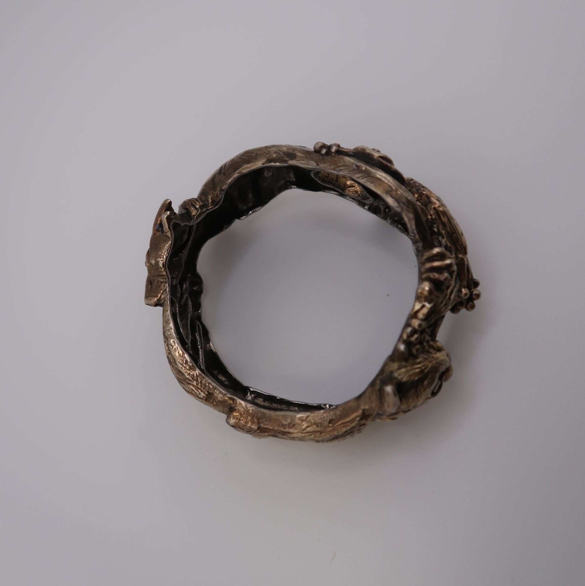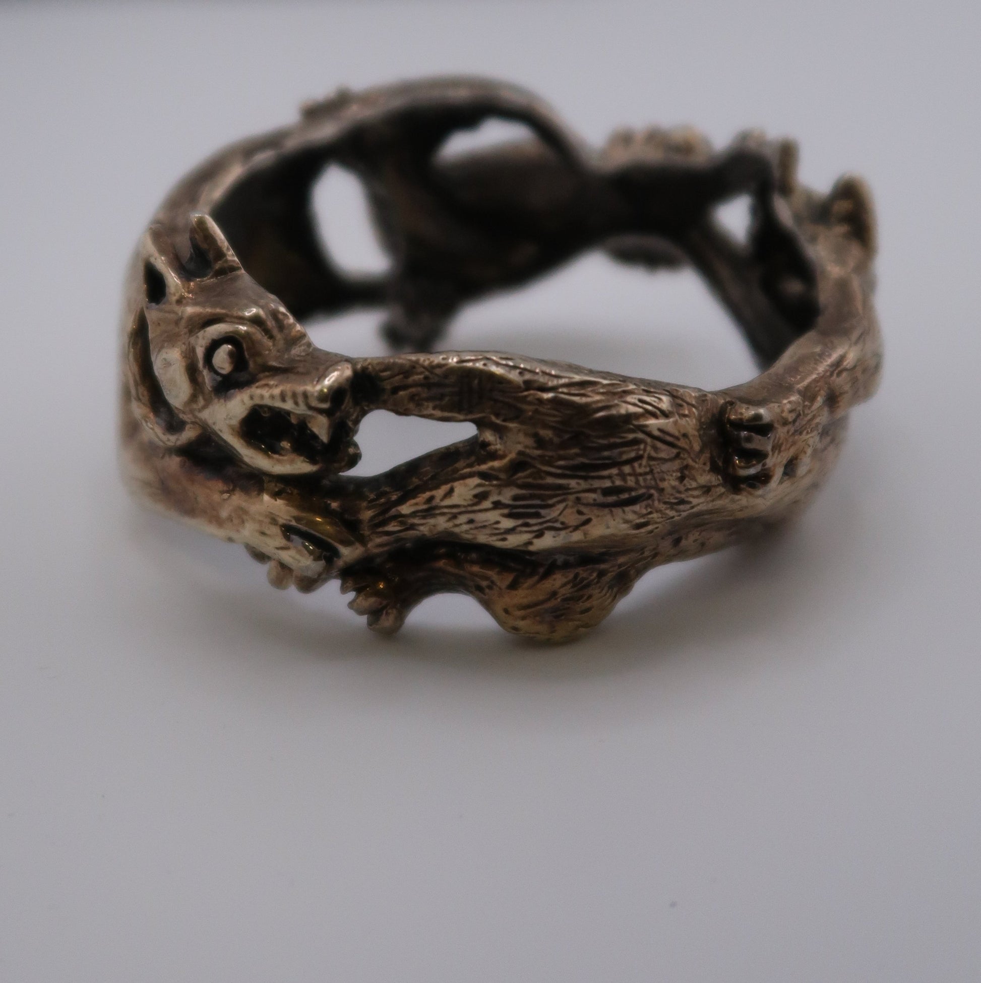 The dog, the cat and the bird are caught in an endless loop of the chasers and the chased. Carved in wax and cast in metal, this is an ornamental reminder of the beauty and brutality of animal life.