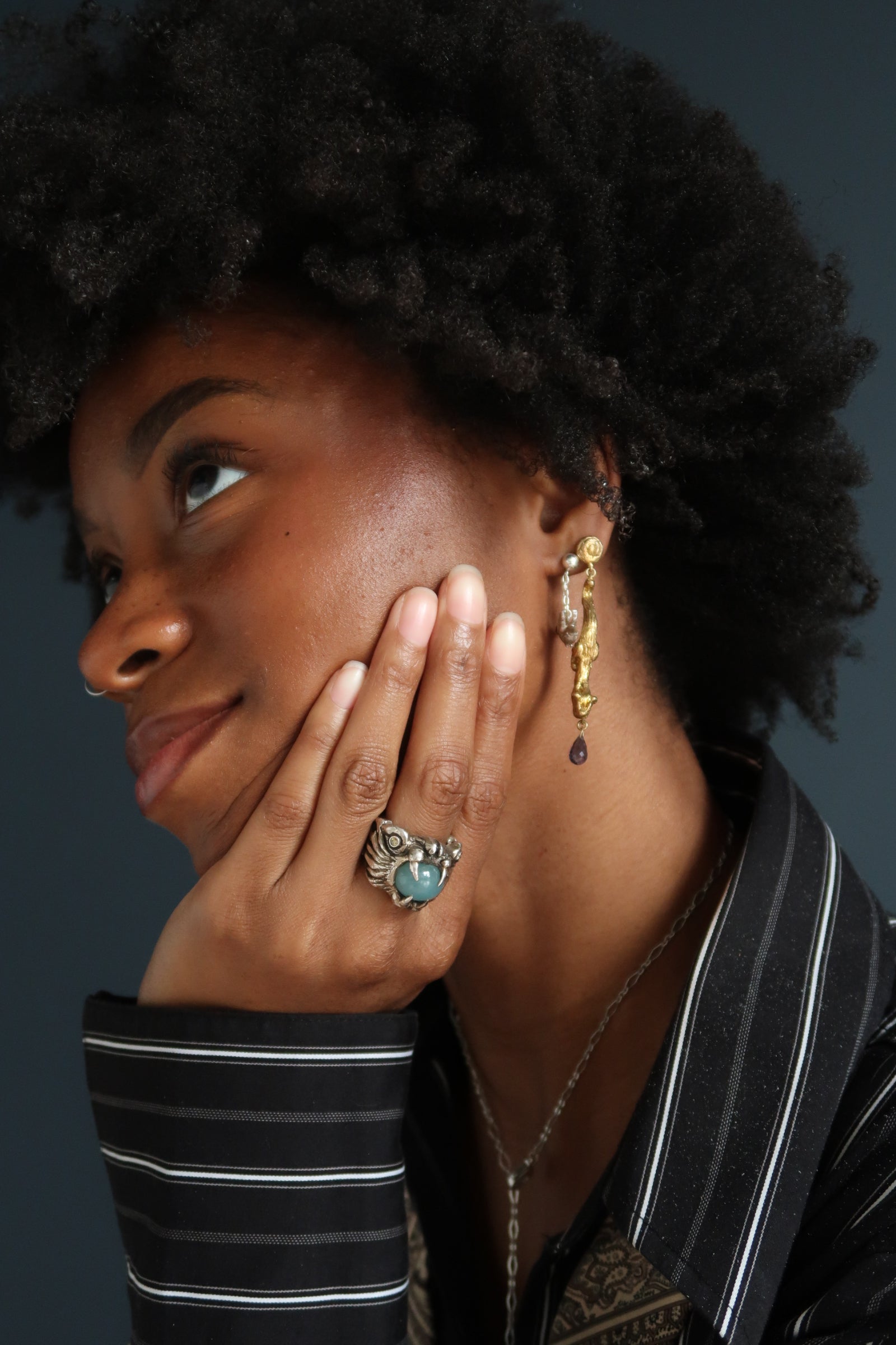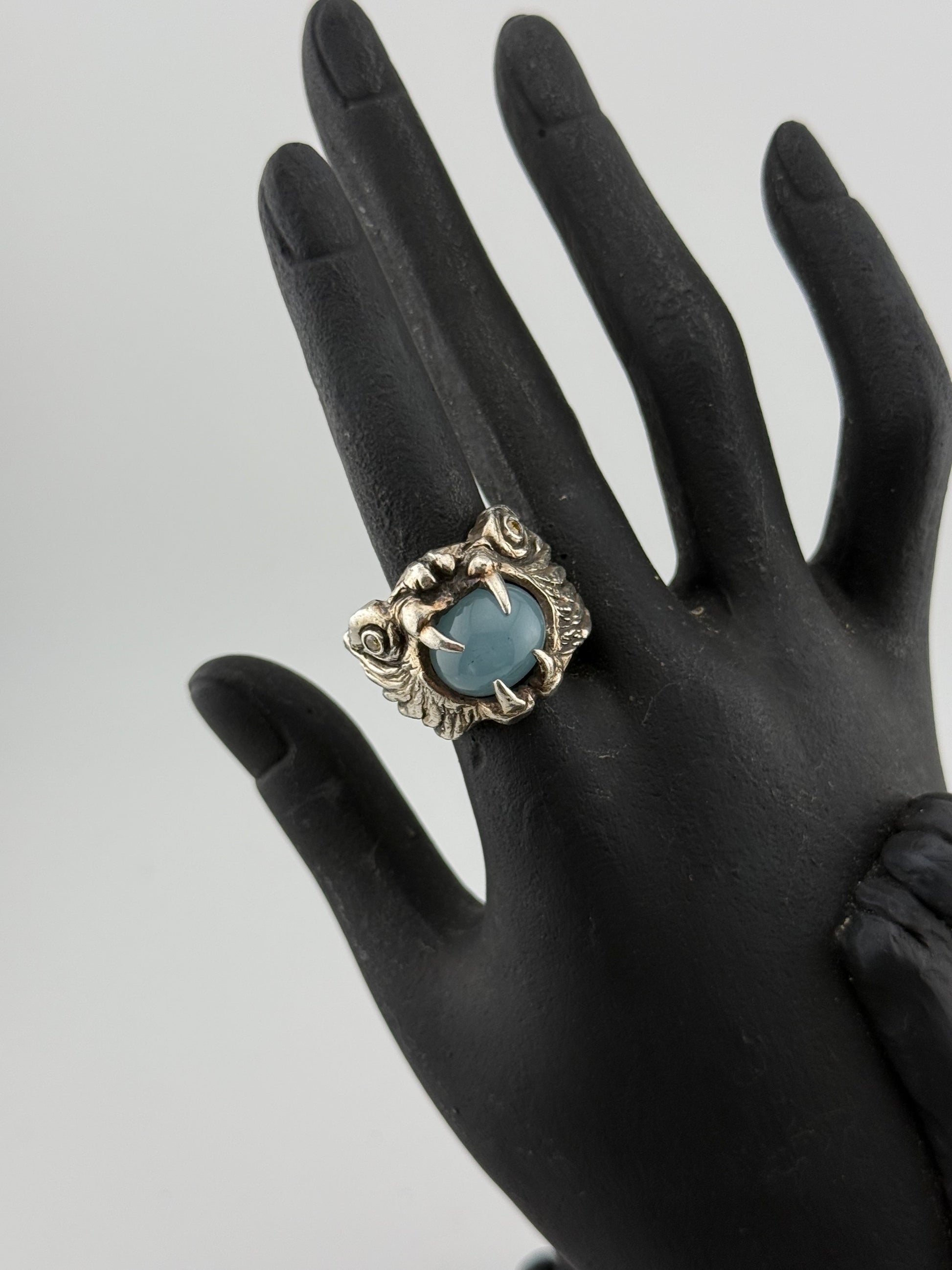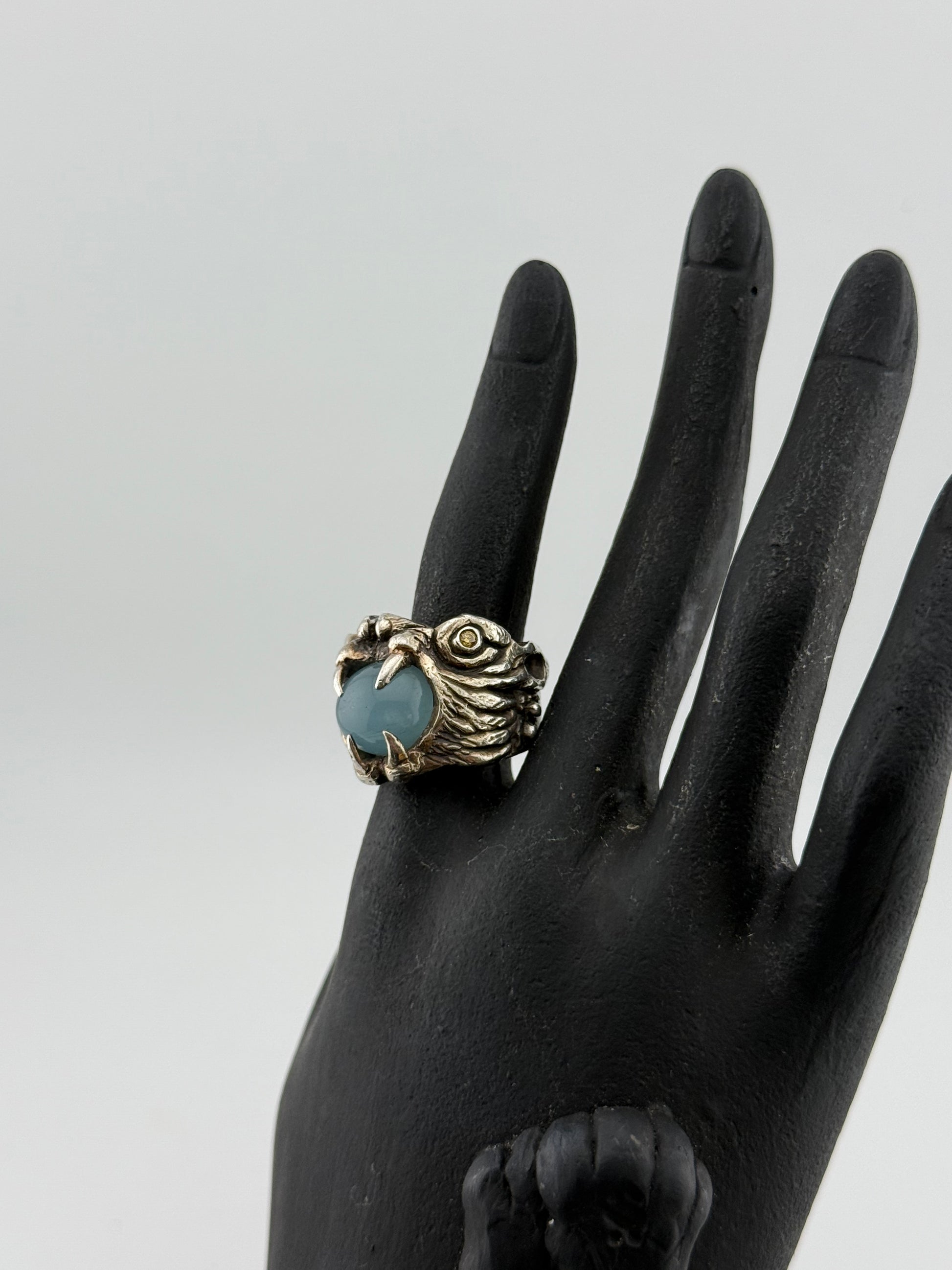 In Greek mythology, Chimera is a hybrid monster made of a lion, a goat, and a snake or dragon. Believed to embody an ancient fear of women, this fire-breathing female entity refers to that which is yearned for and desired by many, but is unrealizable or impossible to obtain. This ring is Jessica's unique and wearable manifestation of Chimera. Carved from wax, casted in sterling silver, set with natural stones and a hand-painted finish.