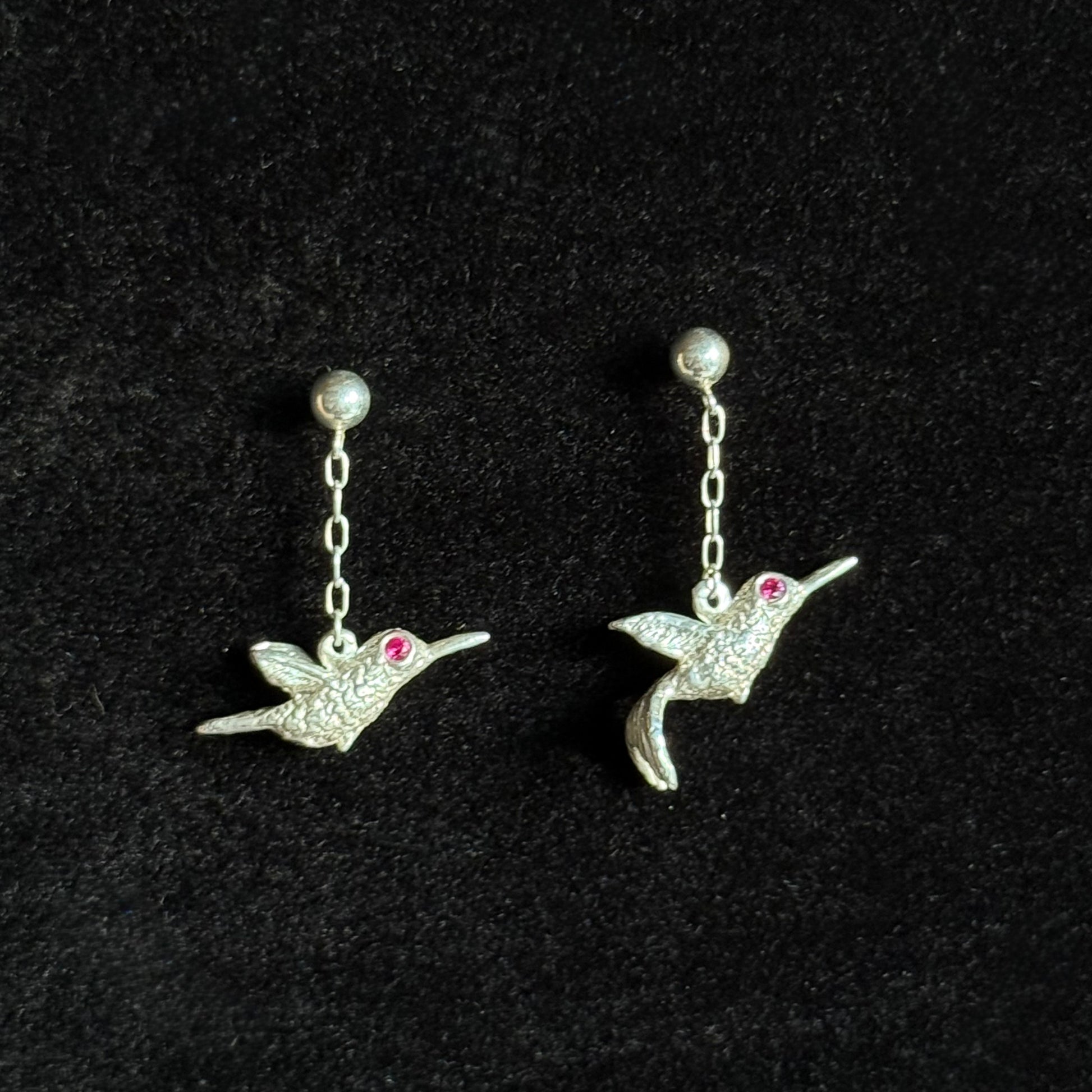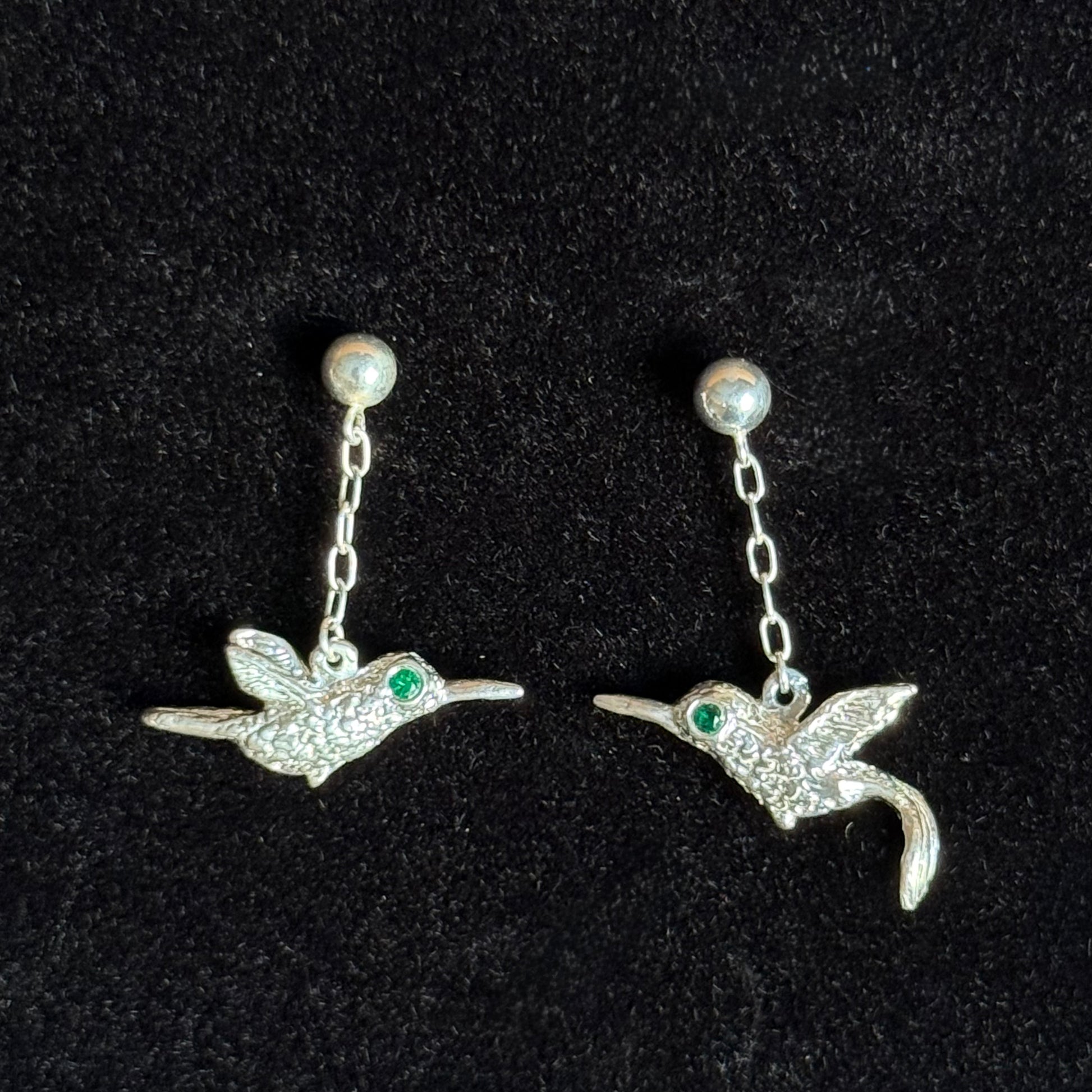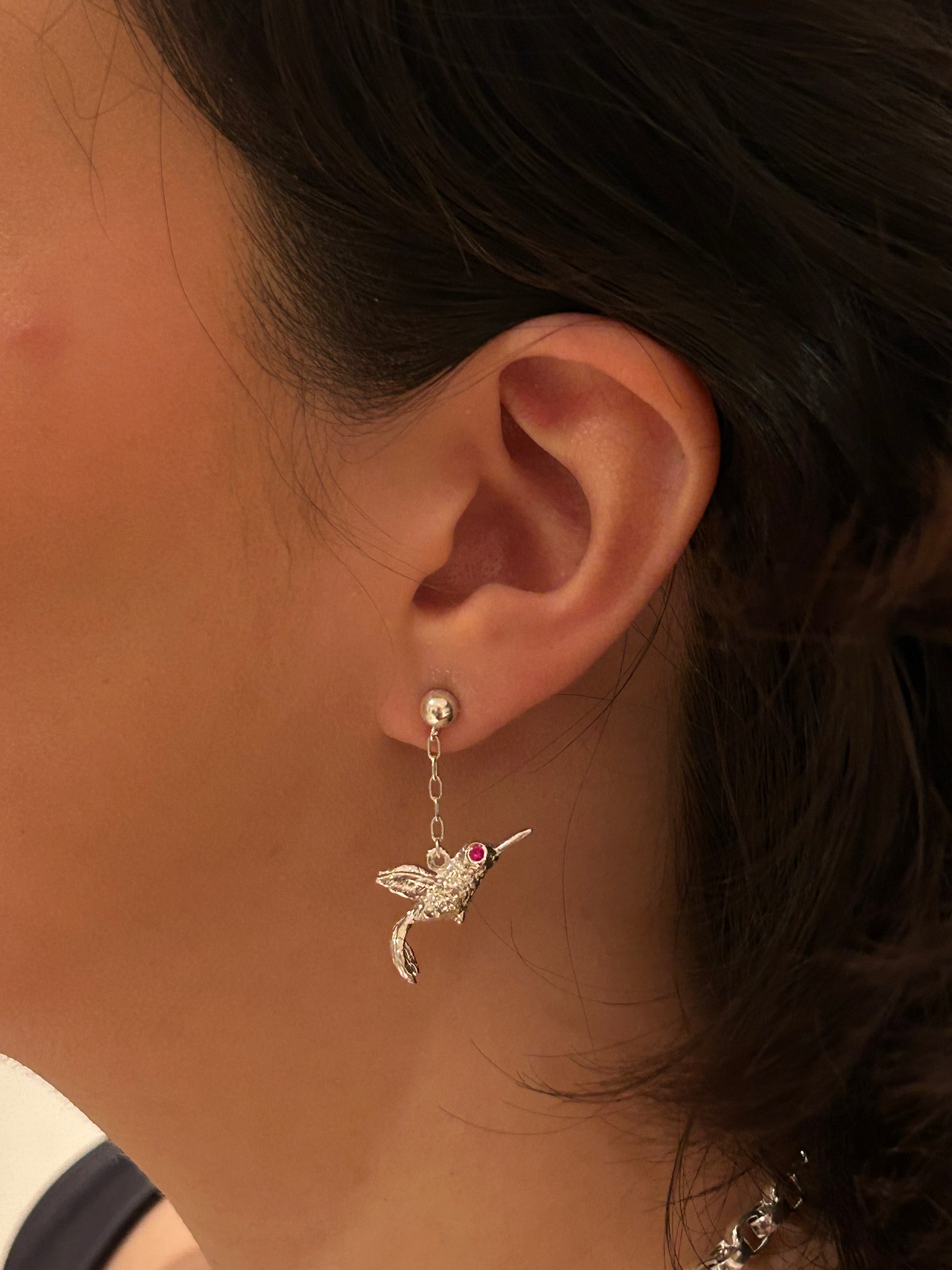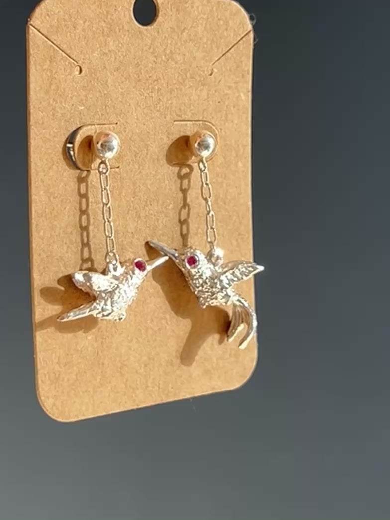 Hand-carved by the artist, this sterling silver pair features both the hummingbird and the fishbird from the story of Girls at the End of the World, illustrating the before and after of this evolutionary allegory. This dangle earring features a delicate chain and a ball back, letting the birds sway and glisten with every turn.