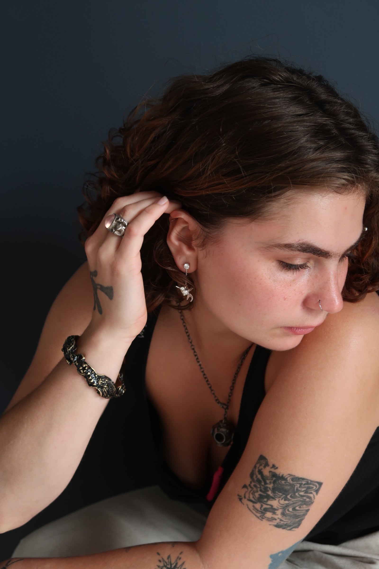 Hand-carved by the artist, this pair represents an ethereal tale of growth and rebirth from the story of the Girls at the End of the World. The fishbird is a JHi original, first illustrated in the Sea Print and eventually created into a wearable embodiment of evolution and fantastical perseverance. This dangle earring features a delicate chain and a moisonite stud, letting the birds sway and glisten with every turn.