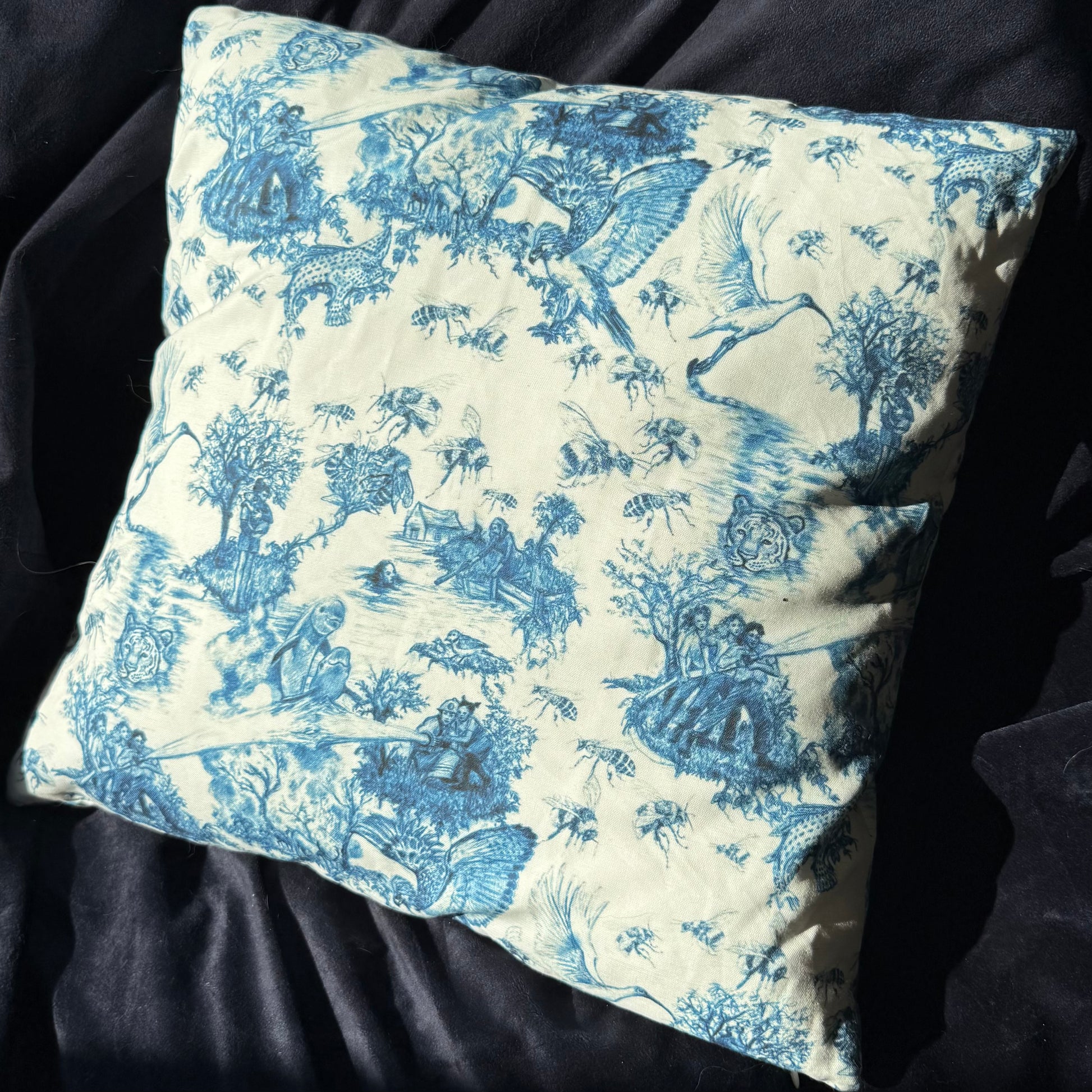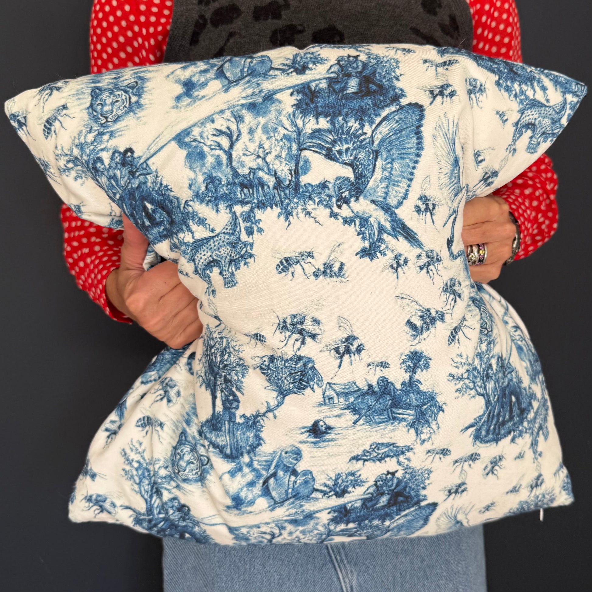 This cushion, in a linen cotton blend, features Jessica's first print designed for the GATEOTW series. It is her take on the toile style of the 18th century. She has used this print as a wallpaper and various soft furnishings in her installations. It depicts young women fighting fires and floods surrounded by animals, affected in their own ways by the brutal effects of global warming. The print is designed to be both decorative and thought-provoking.
