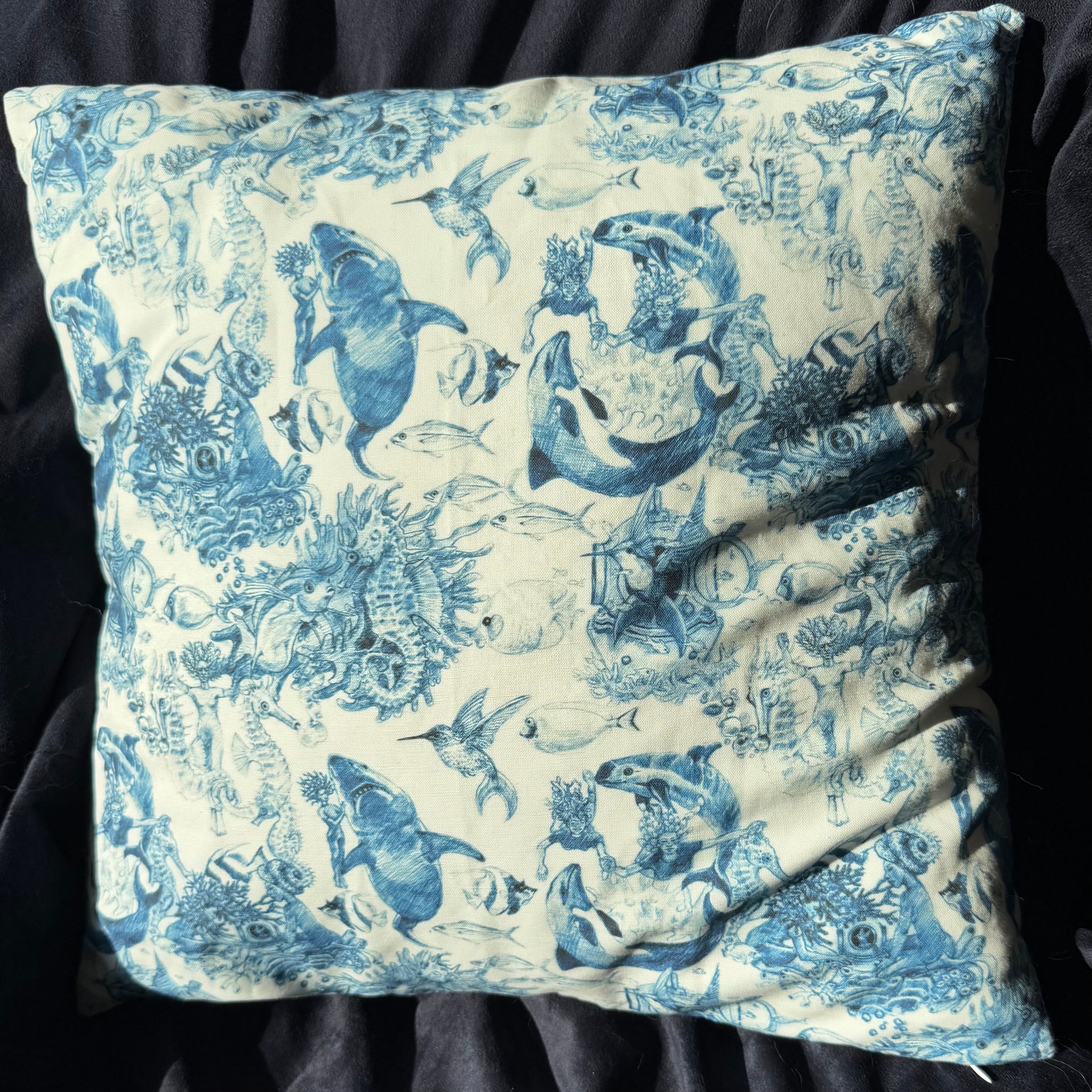 This linen cotton blend cushion features the second print design for the Girls at the End of the World, where the girls bring a hummingbird underwater inside a divers helmet that grows a fishtail and swims free. The narrative of this print spans across the entire collection.