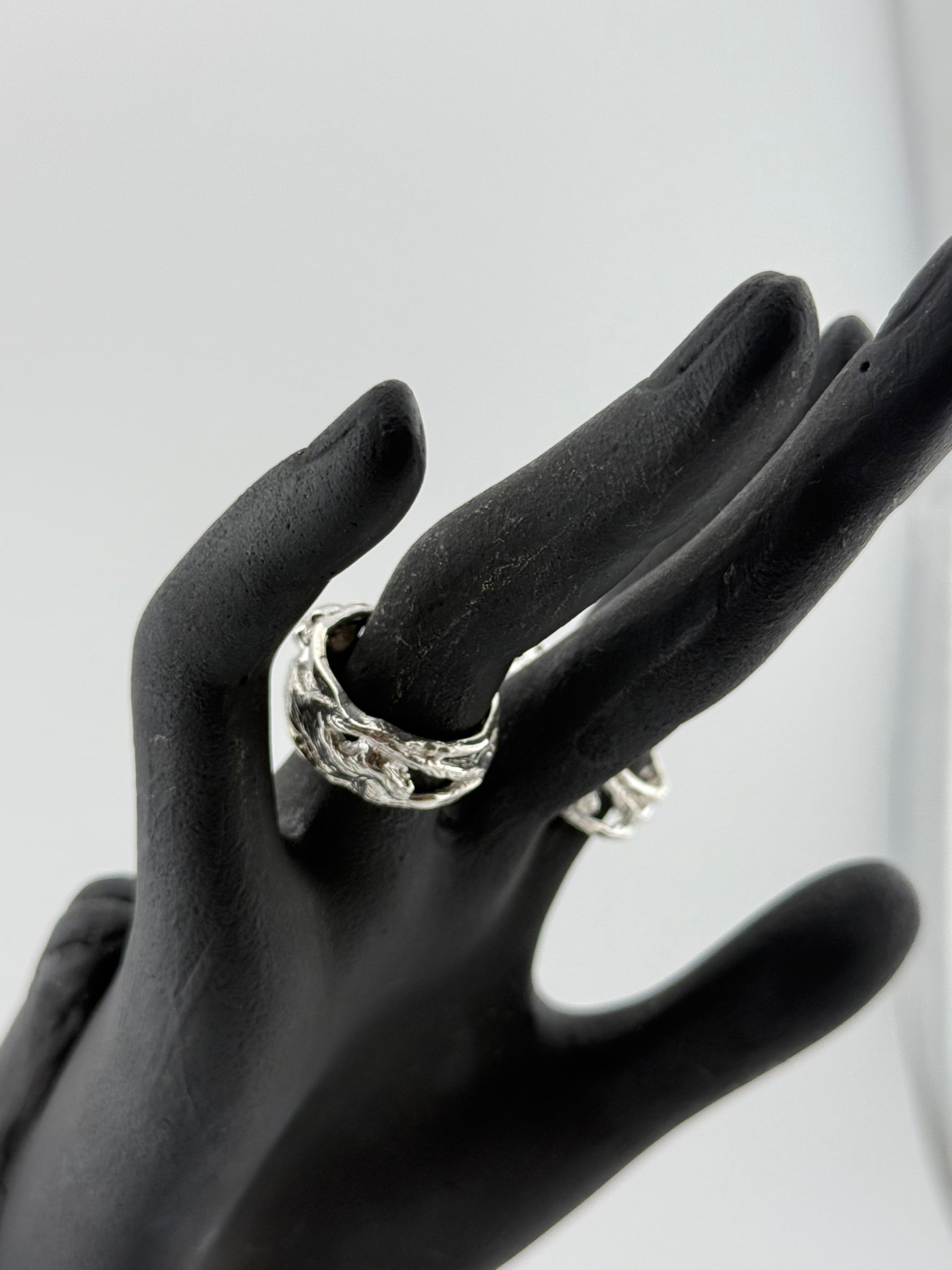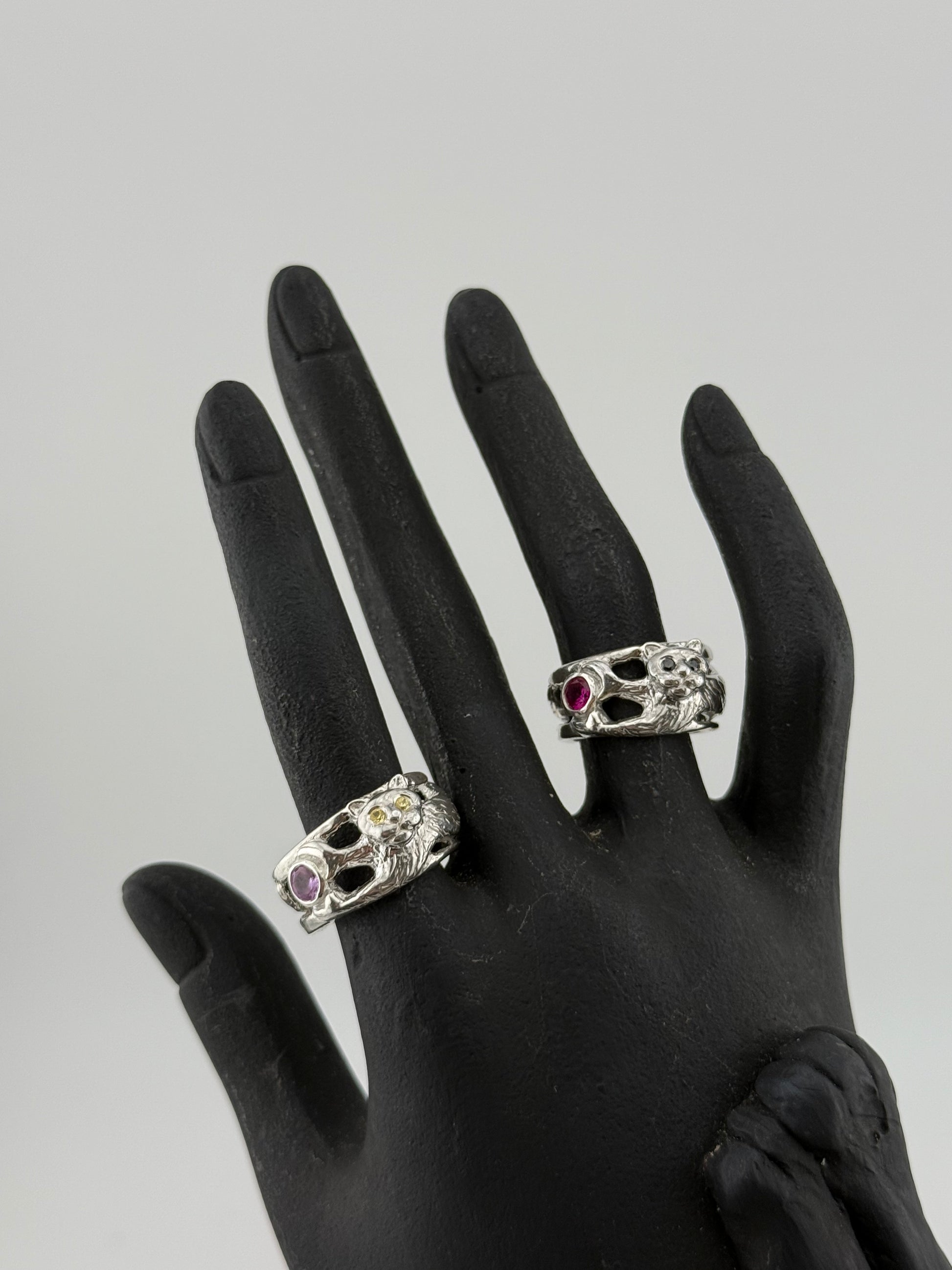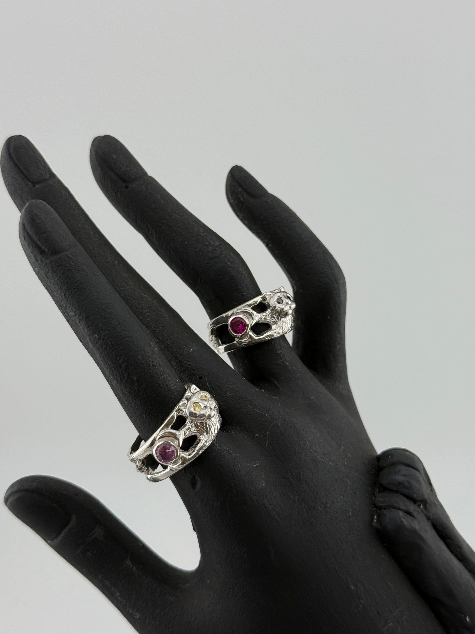 The Little Hunter ring features a small cat wrapped around the finger, whimsically passing the time by playing with a ball. Hand-carved and finished by the artist, this ring can be custom made in various metals and with or without gemstones in the eyes and as the ball. This is our smallest ring.