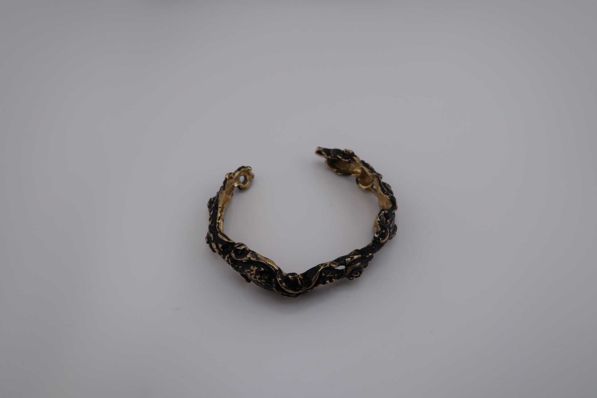 Made of brass and cold enamel, this cuff has a satisfying weight, texture, and sound. You might find yourself tracing your fingers across the surface as you move through your day, uncovering a new detail each time.