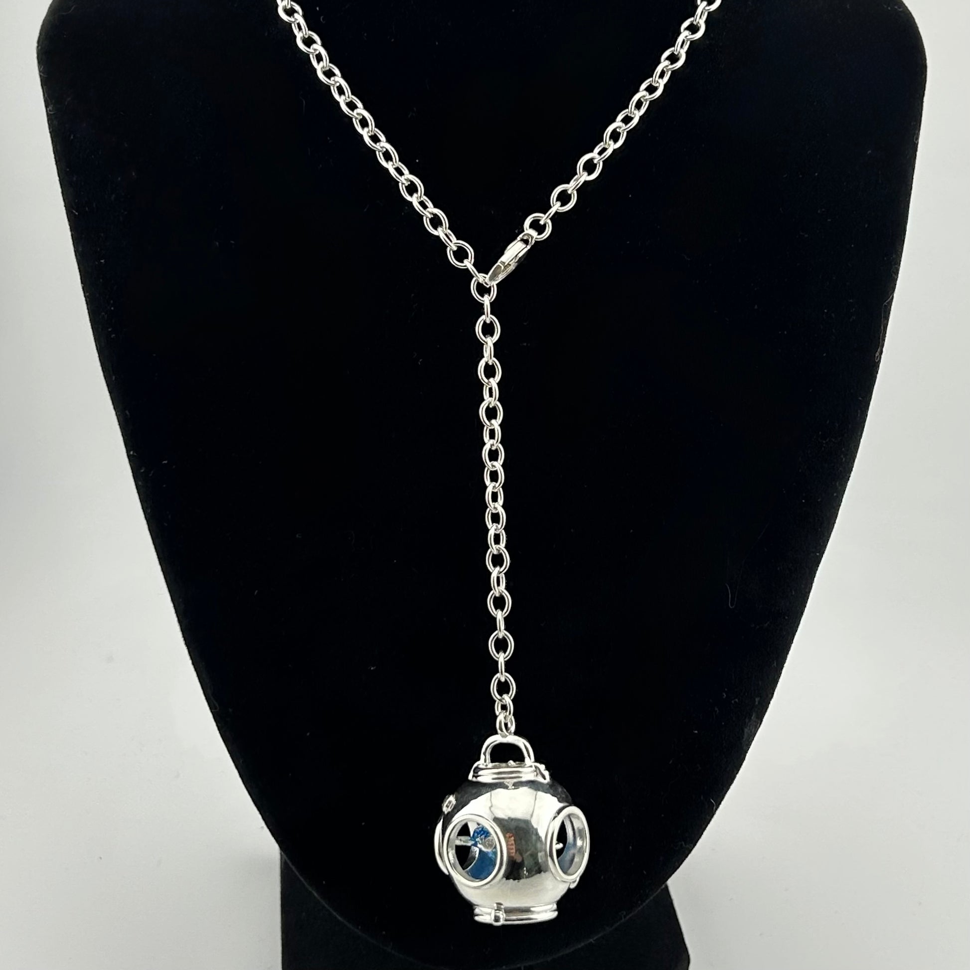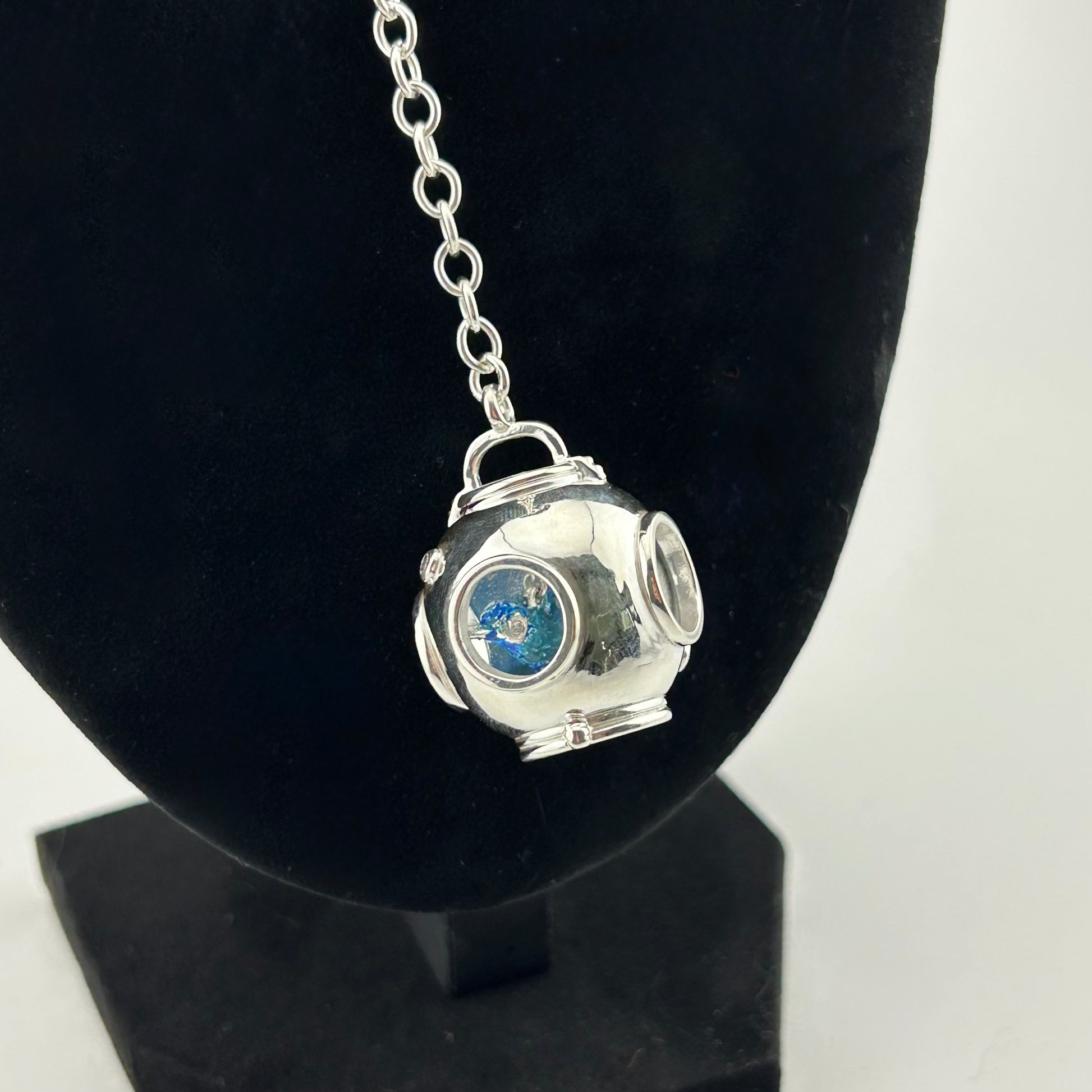 The Aquanaut's Amulet is a wearable talisman from the Girls at the End of the World narrative. Within this series, Jessica created a post-apocalyptic feminist utopia driven by the idea that we must evolve if we wish to endure. The diver's helmet, with a hummingbird suspended inside, serves as a protective charm to the lucky wearer.